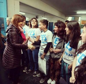 Los estudiantes de la Federación de Estudiantes Secundarios de Avellaneda que la recibieron, le hicieron entrega de un guardapolvo con el rostro de Santiago Maldonado y la consigna «Los lápices siguen escribiendo y preguntando…¿Donde está Santiago?.
