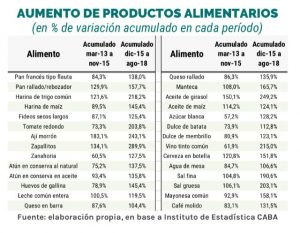 El informe realiza un análisis detallado sobre el aumento de los productos más importantes y explica: «El peso de la canasta de alimentación esencial se incrementó fuertemente sobre los presupuestos familiares. Por caso, el porcentaje medio de costo de una canasta en relación a una AUH subió 7,4 puntos porcentuales. En relación a una jubilación mínima aumentó 1,4 puntos y en función al salario medio subió en 0,7 puntos. Con todo, la canasta media aumentó casi 40% en el último año, lo cual acumula un 120% desde el año 2015.».