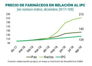 Los productos de la canasta que han sufrido mayor aumento son el pan y la harina. En el gráfico se observa como fue el aumento de estos productos en relación al IPC desde diciembre de 2017 hasta agosto de este año. «Al desglosar el precio de los bienes y, en particular de los alimentos, se puede ejemplificar el fenómeno antedicho. A partir de los precios medios publicados por el índice de CABA se observa como la suba del dólar genera una fuerte alza en los productos más primarios, como la harina y, en menor medida en sus derivados».