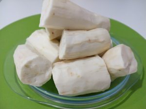 Primero debemos pelar la mandioca. Como su cáscara es bastante dura, no hay que hacerlo con un pelapapas sino con un cuchillo, que debe estar afilado para hacer la tarea más fácil y evitar lastimarnos.