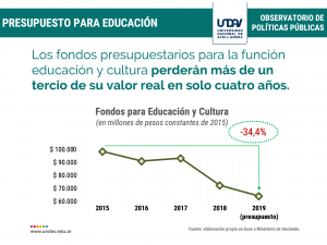 Asimismo, de la lectura del presupuesto 2019, se desprende que los fondos presupuestarios para la función educación y cultura perderán más de un tercio de su valor real en cuatro años. En sintonía con esto, uno de los programas más relevantes para el acceso a la educación como el PROGRESAR está sufriendo una licuación significativa: producto de la decisión de no actualizar el estipendio en 2019, tendrá una caída real del 57,8% desde 2015.