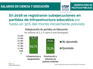 Por otra parte, el desfinanciamiento también se dio en universidades, ya que si se considera que el crecimiento durante 2018 de los fondos fue de un 22,4% podemos deducir que el incremento es menor a la mitad de la inflación acumulada durante el año. Asimismo, en 2018 la función presupuestaria de educación cerró con una subejecución del 8,5% y se registraron subejecuciones en partidas de infraestructura educativa por hasta un 30% del monto inicialmente previsto.