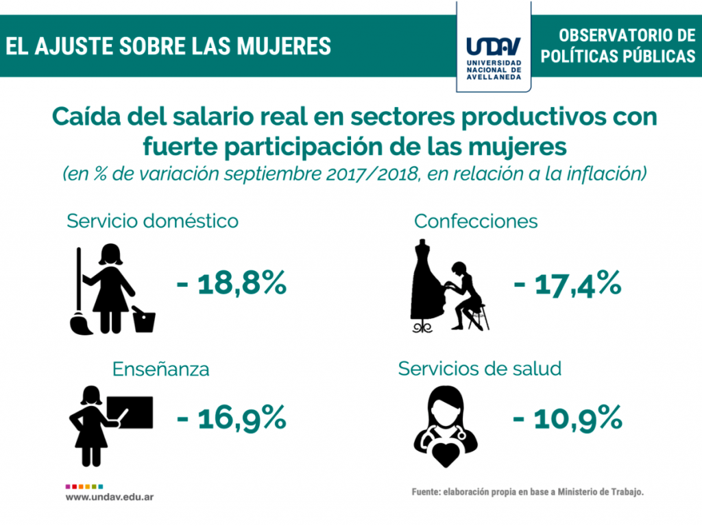 En este marco, ha habido entre septiembre de 2017 y el mismo periodo de 2018 una notoria caída del salario real en sectores productivos con fuerte participación de mujeres, como servicio doméstico (-18,8%); confecciones (-17,4%); enseñanza (-16,9%); y servicios de salud (-10,9%).