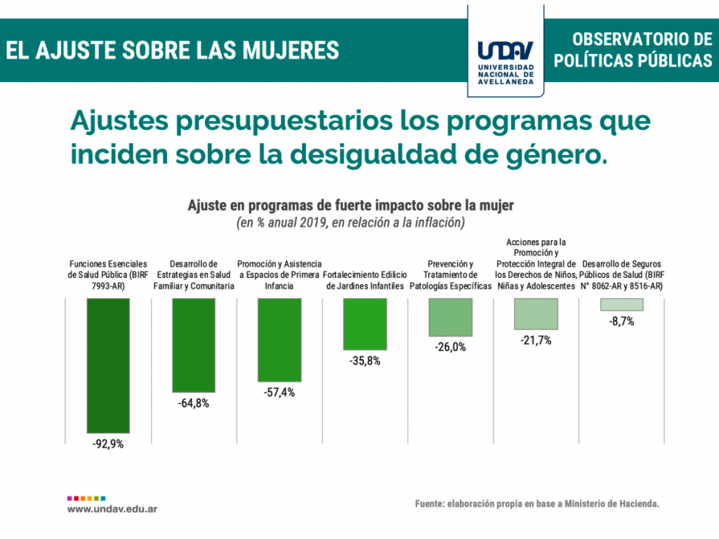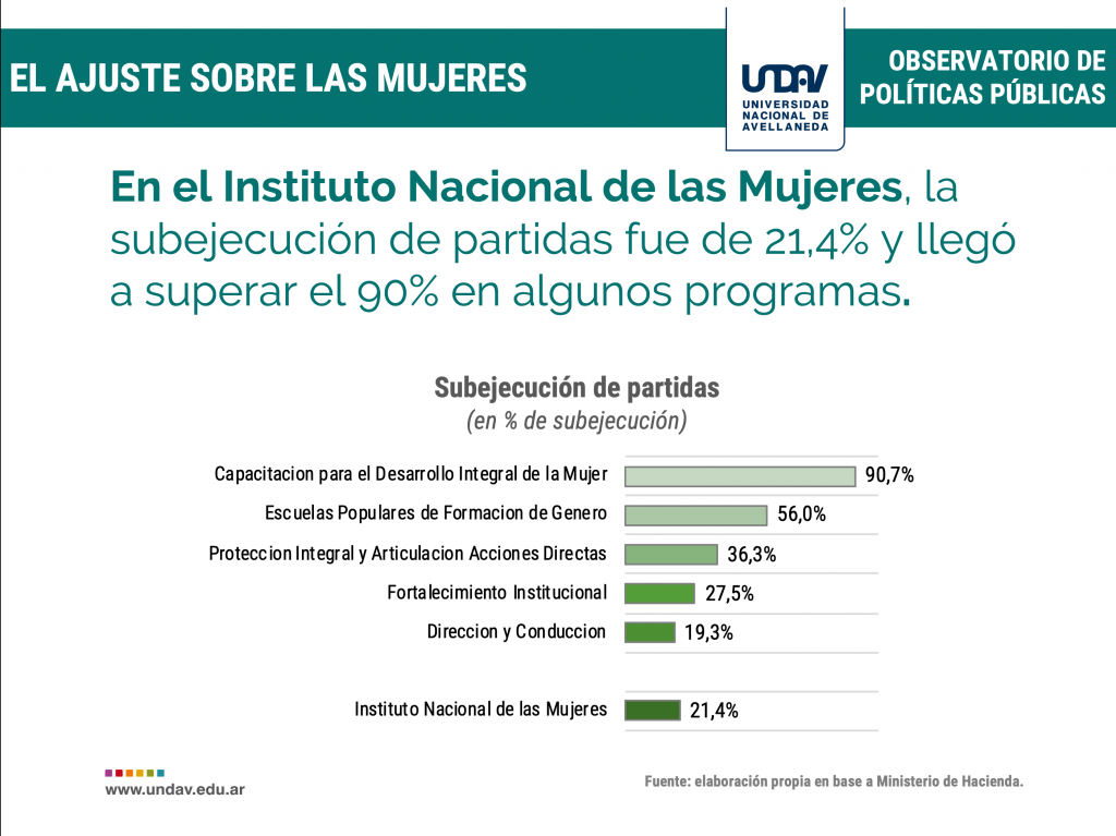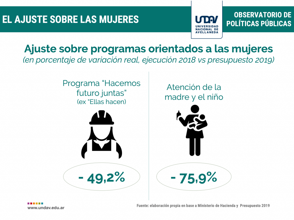 Por otra parte, el estudio apunta que el Instituto Nacional de las Mujeres (INAM), encargado de llevar a cabo la Formulación e Implementación de Políticas Públicas de la Mujer, recibirá este año un recorte del 0,7% en términos reales con relación al presupuesto vigente en 2018 y del 7,3% respecto a la ley de presupuesto de 2018.