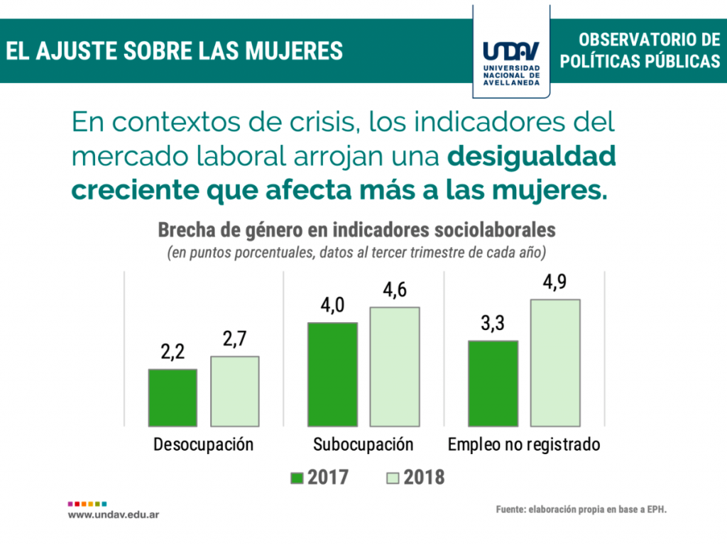 Según la Encuesta Permanente a Hogares, durante el tercer trimestre de 2018 el aumento en la tasa de desocupación, subocupación y empleo no registrado fue mayor en las mujeres (+1pp, +1,3pp y +0,9pp) que en los varones (+0,5pp, 0,7pp y -0,7pp, respectivamente), incrementando las brechas en promedio 0,9 p.p. respecto al mismo período del año anterior.