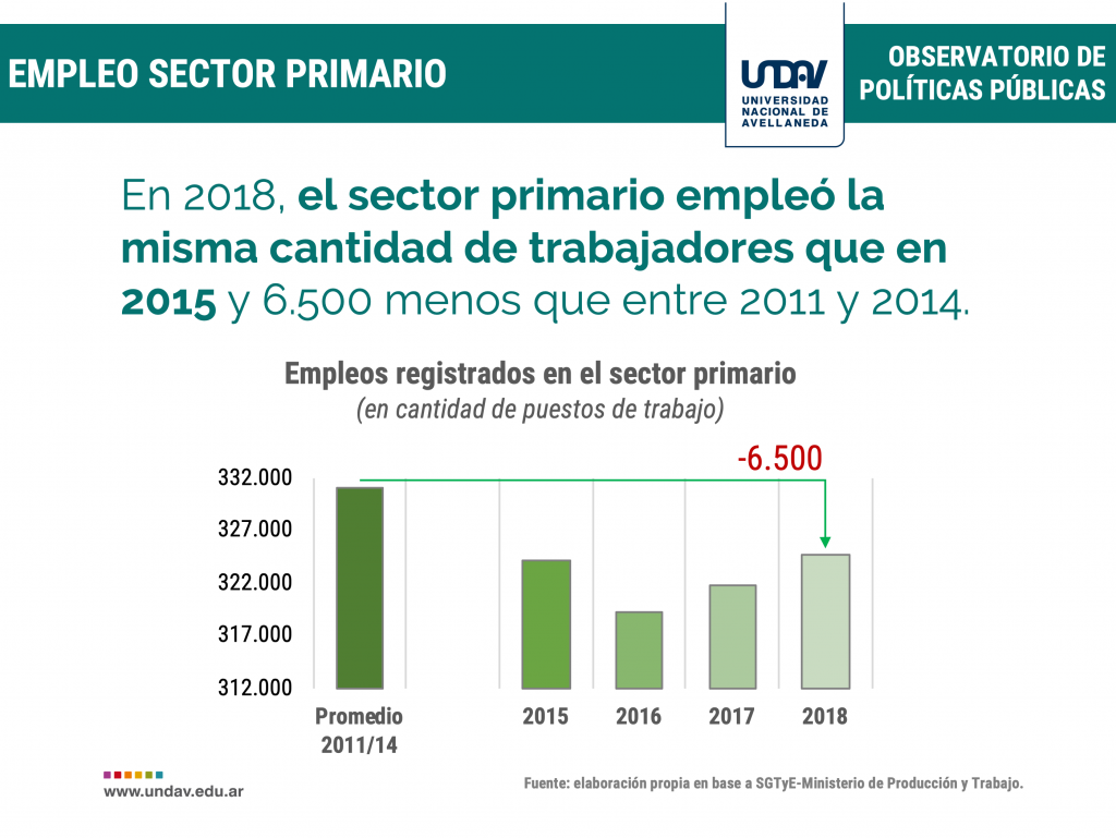 Según reveló el Observatorio de Políticas Públicas de la Universidad Nacional de Avellaneda (UNDAV) en el plano del mercado de trabajo, el sector primario no logró traccionar al alza la creación de empleo de calidad: en los tres últimos años el sector no logró superar los niveles de empleo de 2015 y, en comparación al período 2011/14, destruyó más de 6.500 puestos de trabajo registrados.