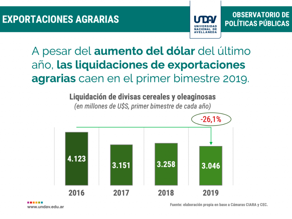 En este sentido, a pesar del aumento del dólar del último año, las liquidaciones de exportaciones agrarias caen en el primer bimestre de 2019. Si nos remitimos a 2015, la retracción de liquidaciones asciende a 26,1%.