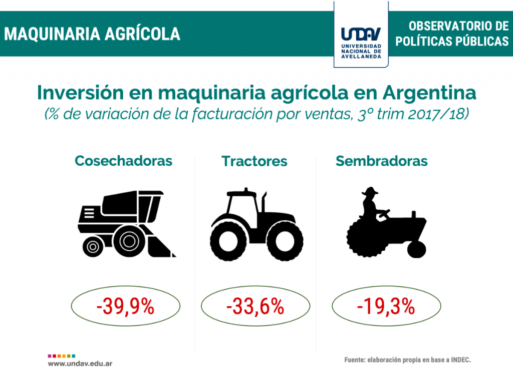 En tanto que la sequía y las magras expectativas de reactivación decantaron el año pasado en una menor inversión en maquinaria y equipo: con datos para los primeros nueve meses del año pasado se tiene que las ventas de cosechadoras se redujeron casi 40%, las de tractores bajaron 33,6%, las de implementos productivos se achicaron 27,5% promedio, las pulverizadoras mostraron una retracción del 25,8% y las sembradoras cayeron en 19,3%.
