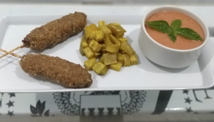 - Rebozador: el que prefieras, puede ser pan rallado, avena, cereales procesados. Yo usé salvado de trigo condimentado con un poco de curry y cúrcuma.