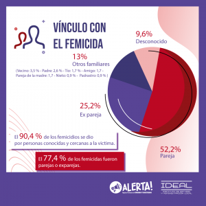 recopilación de datos, es que las mujeres mueren en mayor medida en mano de varones de su círculo íntimo, predominantemente de parejas, un 52,2% y ex parejas, un 25,2% . El 90,4 % de los femicidios se dio por personas conocidas y cercanas a la victima.