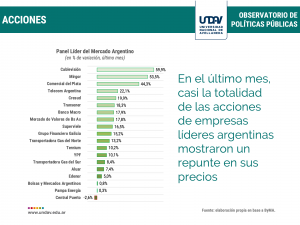 Con respecto a los valores de las empresas lideres argentinas, el informe de la UNDAV expone que, casi la totalidad de las acciones obtuvieron una alza de sus precios.