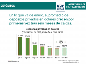 Por último el informe de la UNDAV expone que, en lo que va de enero, el promedio de depósitos privados en dólares crecen por primera vez tras seis meses de considerables caídas.