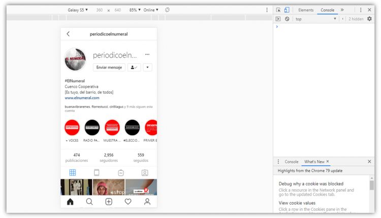 Una vez hecho esto, tecleamos la siguiente combinación de teclas: Ctrl+Shif+M y luego F5. Lo que ocurrirá es que, debajo de la pantalla de vista previa de Instagram, aparecerá la barra de opciones tal y como la vemos desde nuestros teléfonos móviles. Desde allí, seleccionaremos en el ícono del “+” y buscaremos entre los archivos de nuestra computadora qué fotografía queremos compartir.