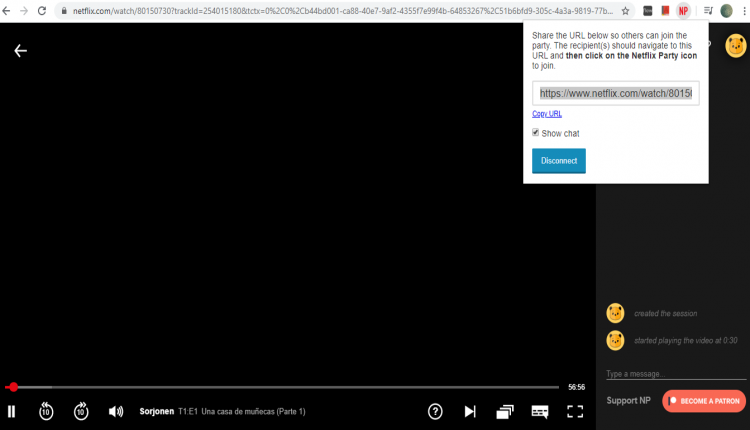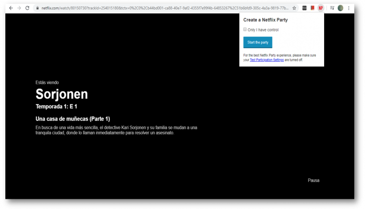 Para activar Netlfix Party debemos ingresar a nuestro perfil de Netflix, elegir una serie o película para ver y hacer click en el ícono de la extensión.