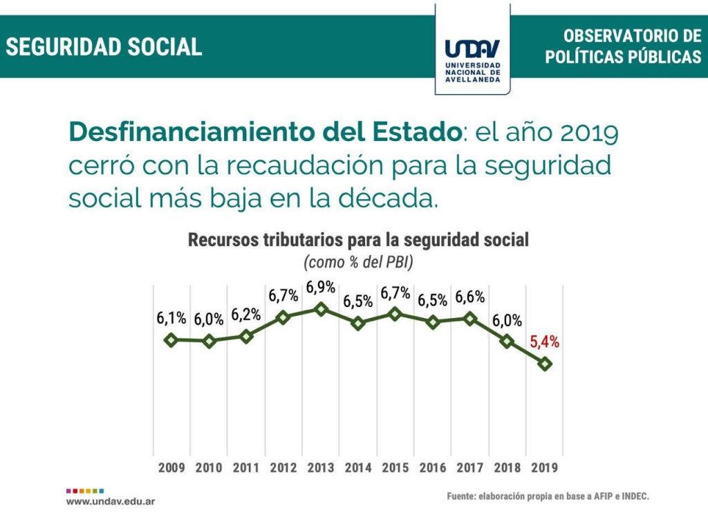 Dentro de la estructura tributaria se encuentran las Contribuciones Patronales y los Aportes Patronales a la seguridad social. La tendencia a la caída que se observa en los últimos años da cuenta del desfinanciamiento del sistema de seguridad social.