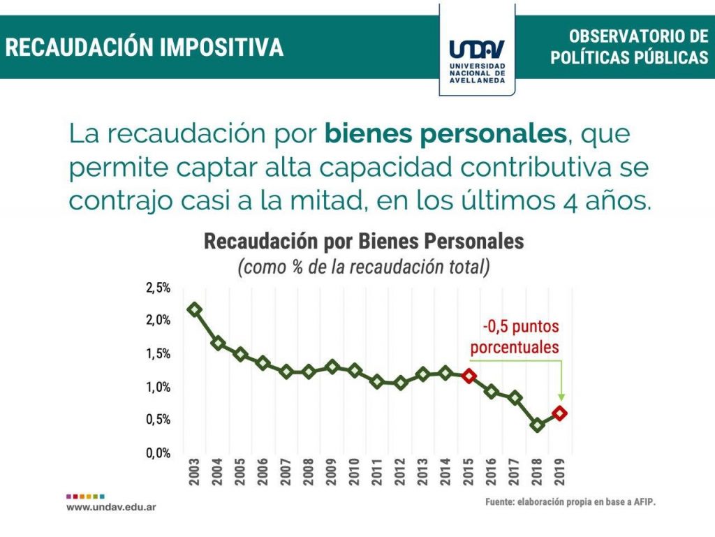 El impuesto a los Bienes personales es otro de los impuestos más progresivos que hay, ya que grava el patrimonio, y se va incrementando la alícuota a medida que el mismo crece. Su incidencia bajó en el total de la recaudación a partir del 2016, producto de modificaciones impositivas con objetivos de incentivar el blanqueo de capitales. Así, la administración anterior aplicó un mecanismo de descenso gradual de las alícuotas desde ese mismo año.