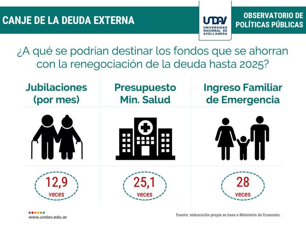 En el gráfico podemos analizar a qué se podrían destinar los fondos que se ahorran con la renegociación de la deuda hasta 2025. Se podría destinar 12,9 veces más en jubilaciones, 25,1 veces más en el Ministerio de Salud y 28 veces más en el IFE.