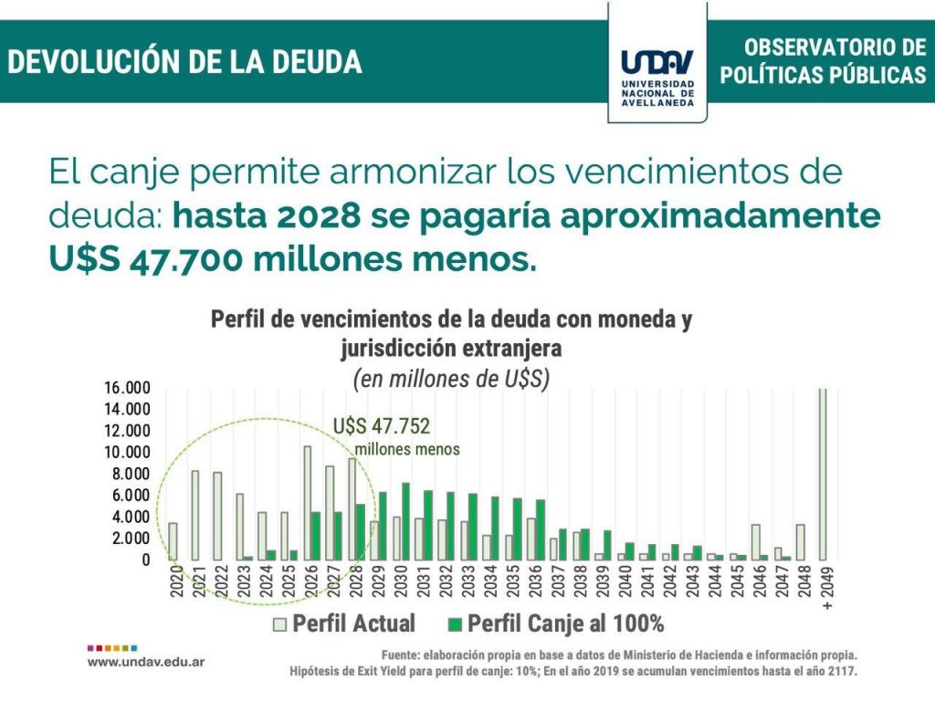 Segun analiza el Observatorio de Políticas Públicas de la UNDAV, el canje de deuda en moneda extranjera permitirá descomprimir vencimientos por más de U$S 47.000 millones.