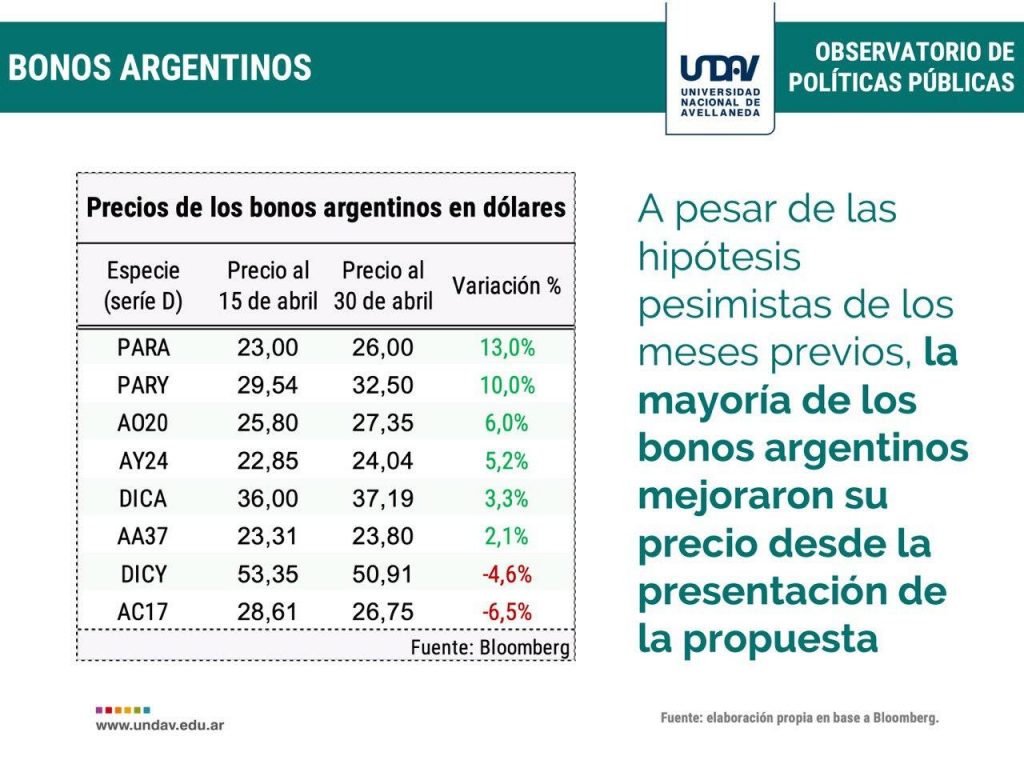 Si bien la propuesta fue rechazada por los acreedores, al tener conocimiento sobre la oferta empiezan a tener certezas de lo que está dispuesto a pagar el gobierno para evitar una cesación de pagos. Por este motivo, se observa la evolución de los bonos argentinos más representativos desde el día previo a la presentación realizada a los tenedores de títulos argentinos (16 de abril) hasta el último día del mes, lo que cubre un periodo de 15 días.