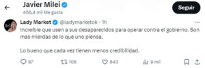 Sin embargo, Javier Milei avaló un comentario de una influencer libertaria contra la denuncia realizada por HIJOS. “Increíble que usen a sus desaparecidos para operar contra el gobierno. Son mas mierdas de lo que uno piensa”, se lee en el tweet publicado por la usuario @LadyMarketok y likeado por el mandatario.