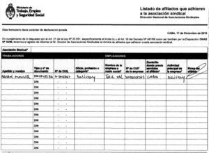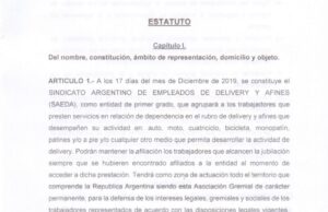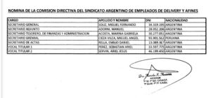 En profundidad. “Listado de afiliados que adhieren a la asociación sindical”, dice el encabezado del documento presentado el 17 de diciembre de 2019, a pocos días de la asunción de Alberto Fernández. Adorni se inscribió como trabajador de “delivery”, ya que era empleado de Tesir SRL, una empresa dedicada al rubro de la mensajería. En los papeles para solicitar la inscripción gremial, el vocero presidencial buscaba secundar en el gremio a Miguel Fernando Soliz, quien sería el secretario general.