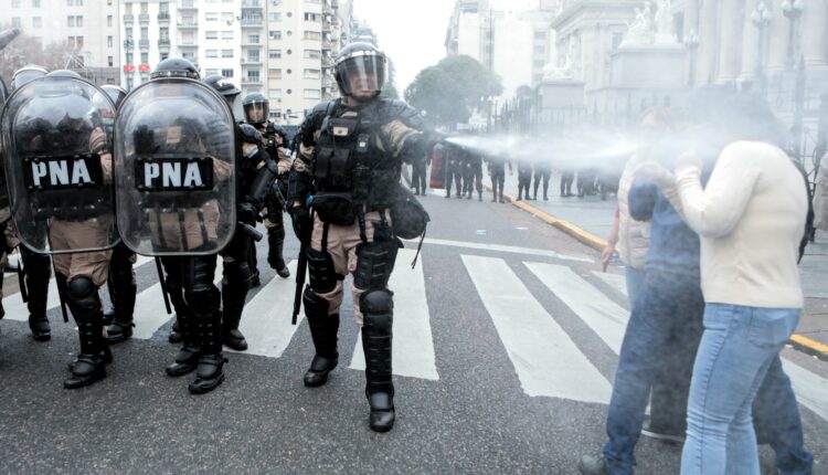 La represión de las fuerzas de seguridad estuvo presente toda la tarde. Los efectivos de las diferentes fuerzas aplicaron el denominado protocolo antipiquetes de Patricia Bullrich mientras en la Cámara alta debatían la iniciativa.