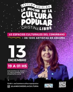 Hay noches que no son una simple agenda cultural. Son una toma de posición. Este sábado 13 de diciembre, de 19 a 01, vuelve La Noche de la Cultura Popular en su séptima edición y lo hace con una consigna que interpela de frente al presente político argentino: Cristina Libre.