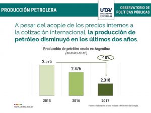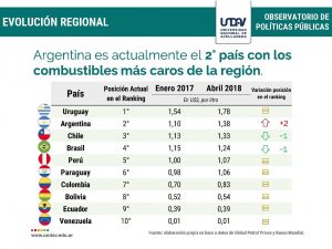 A su vez, agrega: «En materia de producción petrolera, los resultados no son auspiciosos. En los dos últimos años la caída acumula un 10%. Otro aspecto sustantivo en el plano interno son las disparidades regionales. Por motivos geográficos, impositivos y la estructura de competencia del mercado, se presentan diferenciales de hasta un 46% entre las provincias del Sur y del NOA/NEA. Con todo, Argentina ya es actualmente el segundo país con los combustibles más caros de la región, sólo por detrás de Uruguay.»
