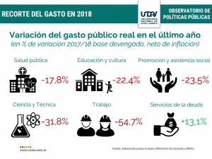 El recorte del gasto en 2018 se produjo en diversas áreas, aunque las más sensibles fueron Trabajo (-54,7%); Ciencia y Técnica (-31,8%); Promoción y asistencia social (-23,5%); Educación (-22,4%); y Salud (-17,8%); ajustes que se dieron pese al incremento en un 13,1% en servicios de la deuda.