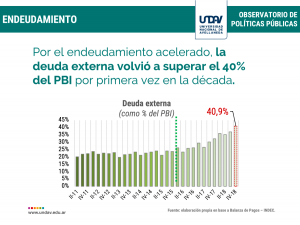 La deuda externa superó el 40% del PBI por primera vez en la década: es decir, que creció más de 17 puntos en tres años, cuando a inicios de 2016 representaba menos de 24 puntos del Producto Bruto Interno, lo que data también de un endeudamiento cada vez más acelerado. “La erogación creciente de intereses se explica por el feroz proceso de endeudamiento de estos años: así, la deuda externa al último trimestre del año pasado creció hasta los U$S 277.000 millones, lo que significa una suba de 18,5% en un año y 66% en relación a igual periodo de 2016”, explica el informe de la UNDAV.