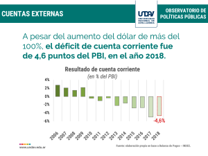 “Las cuentas externas de la economía argentina transitan por años de vulnerabilidad extrema, que hicieron eclosión el año pasado con una crisis tradicional en la balanza de pagos. El agotamiento del ‘sector externo’ del actual modelo encuentra origen en la apreciación cambiaria espuria que se gestó durante 2017, en el marco del interés del gobierno de propiciar un ‘efecto veranito’, en los albores de la elección de medio término. Así, la acumulación de desequilibrios externos, producto de una inflación creciente y un crecimiento famélico, fue determinante de la profunda crisis financiera del año pasado”, apunta el documento universitario.