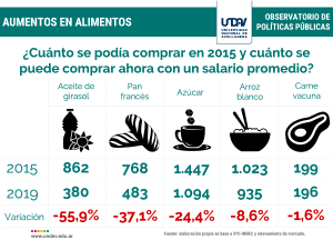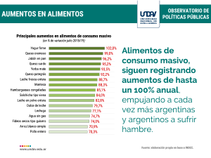 Por último, el informe de la UNDAV indica que los alimentos de consumo masivo incrementaron sus precios hasta un 100% en el último año.