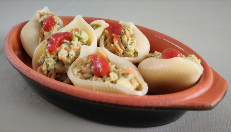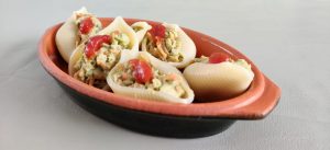 La pasta: Cocinarla al dente el tiempo que corresponda al tipo de pasta elegida. En este caso utilicé unos caracoles grandes así que los herví durante 12 minutos en agua con sal. Dejar enfriar y rellenar, con cuchara o manga, según corresponda. Servirla en un plato grande. Yo decoré con una salsa de tomate y morrones ahumada (para les que les interese, les dejo la receta en los Recetips de abajo).