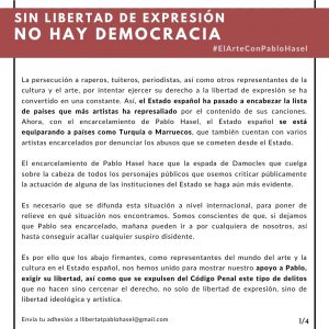Ante el encarcelamiento del rapero, más de 200 artistas, entre ellos el cineasta Pedro Almodóvar; el cantante Joan Manuel Serrat; y el actor Javier Bardem, firmaron un manifiesto en el que reclamaron la liberación Hasél. El texto denuncia que «el Estado español ha pasado a encabezar la lista de países que más artistas ha represaliado por el contenido de sus canciones».
