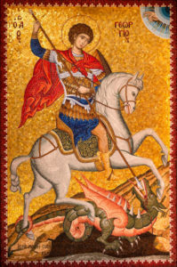 un día fue la princesa del pueblo quien salió sorteada para acompañar al cordero. Y luego de ser llevada ante el dragón, apareció el caballero Jorge, quien mató al dragón clavándole su espada y la salvó. Cuenta la leyenda que de la sangre que brotó del cuerpo sin vida del monstruo nació un hermoso rosal rojo, del cual Jorge extrajo una rosa que entregó a la princesa.