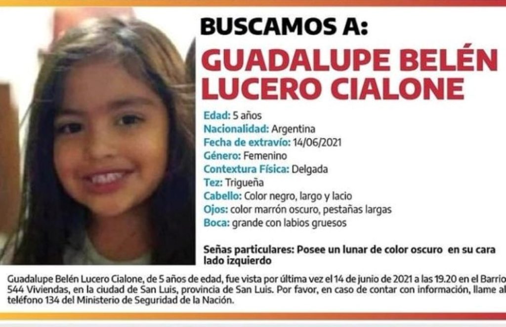 Este martes 14 de junio se cumple un año de la desaparición de Guadalupe Belén Lucero Cialone en San Luis. La niña que desapareció con 5 años fue vista por última vez en el barrio 544 Viviendas de la capital provincial.