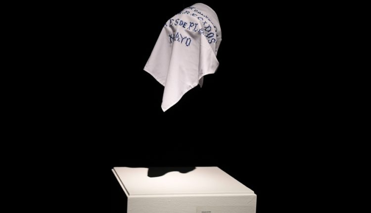 En el otro lado hay una sala a oscuras donde solo se ilumina el pañuelo blanco característico de las Madres montado en un atril y se escuchan de fondo algunos fragmentos de discursos que dio Bonafini a lo largo de su vida.