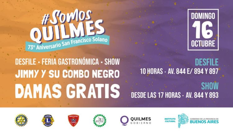 El Municipio de Quilmes invita a los vecinos y a las vecinas a participar de los festejos por el 73º aniversario de San Francisco Solano. Comenzarán en la tarde de este sábado 15 de octubre, con ferias gastronómicas y desde las 18, shows musicales; continuarán el domingo 16 con varias actividades desde bien temprano y con el tradicional desfile. El cierre será a pura cumbia con la presentación de la banda Damas Gratis.