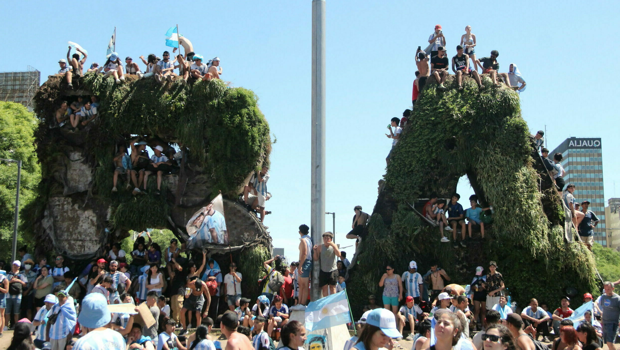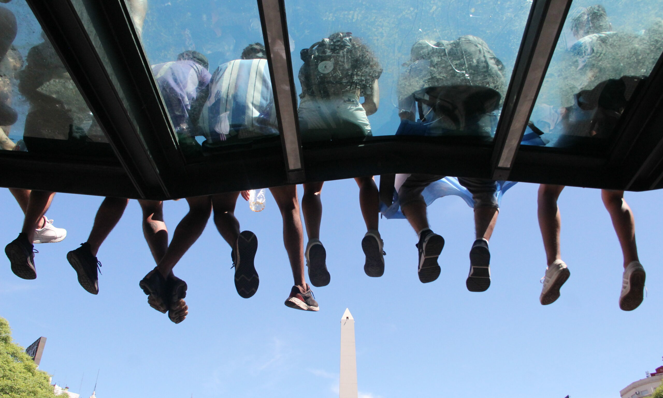 Parecía que cuánto más alto estaba un fanático, más alegre se sentía. Argentinos y argentinas se asomaban y gritaban por los balcones. Se treparon a los semáforos, al techo del Metrobús, a las letras verdes de Buenos Aires, a los patrulleros, puestos de diarios, postes de luz, incluso hasta la punta del Obelisco mediante la escalera interna del monumento.