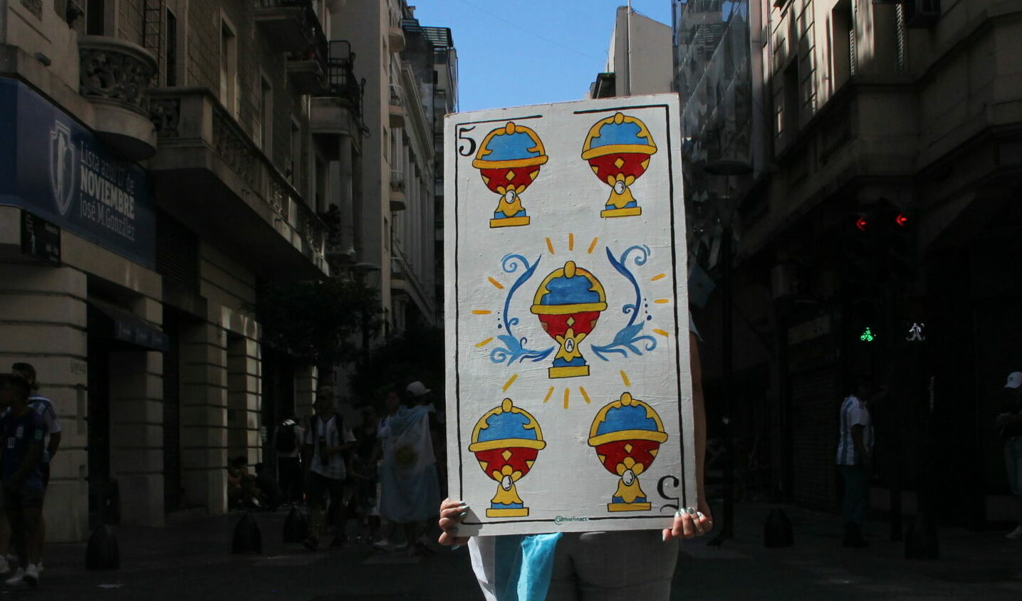 Este es el caso de Martina (21), estudiante de artes visuales, quién llevó la carta del 5 de copas messi en una pintura de más de un metro de altura en honor a Messi.