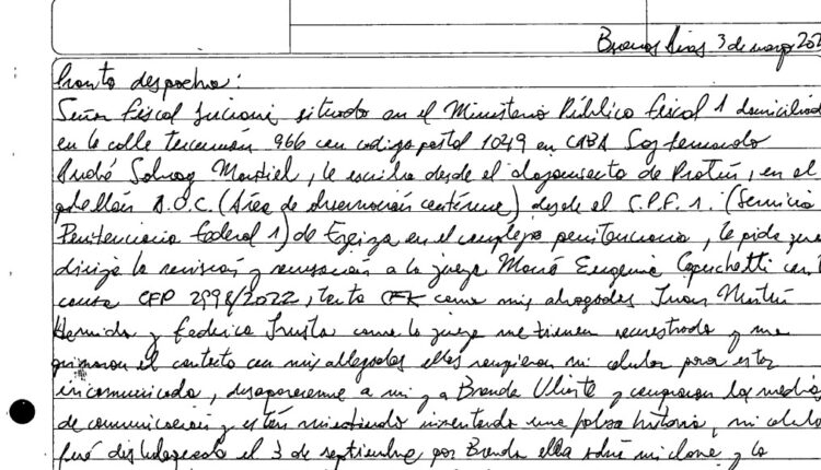 Con una letra por momentos incomprensible y concuestionando a la ex mandataria, a la jueza María Eugenia Capuchetti, al fiscal Carlos Rívolo y a su defensor oficial Juan Martín Hermida, el detenido le pidió a la Cámara Federal que lo “proteja” porque teme ser asesinado cuando lo trasladen a tribunales para el eventual juicio oral en su contra.