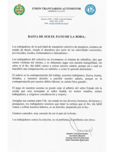 “Los trabajadores de la actividad del transporte de colectivos de pasajeros estamos en estado de shock viendo el abandono por parte de autoridades nacionales y provinciales”, agregó.