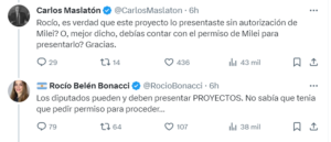 Bonacci, tras el escándalo, intentó salvar su proyecto y se defendió en redes sociales. “Los diputados pueden y deben presentar proyectos. No sabía que tenia que pedir permiso para proceder”, respondió al ser consultada si había tenido autorización del Ejecutivo o del mismo presidente.