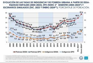 Recordemos que, según otro informe de la UCA, 2023 terminó con una pobreza del 49% y una indigencia del 14%, por lo que la situación socio-económica de millones de personas empeoró sensiblemente en enero. De hecho, se trata de los peores números de pobreza en 20 años, es decir desde 2004, cuando tras la crisis de 2001, el 54% de los argentinos se encontraba debajo de la línea de la pobreza, según la primera medición del observatorio.