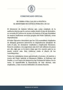 “Se cierra otra caja política”, anunció el Ministerio de Justicia de la Nación el pasado 10 de junio para adelantar la decisión de cerrar 81 de los 111 CAJ que hay en todo el país. En el escrito, sostuvieron que los centros eran “ineficientes” y que “acumulaban empleados sin demostrar resultados”.
